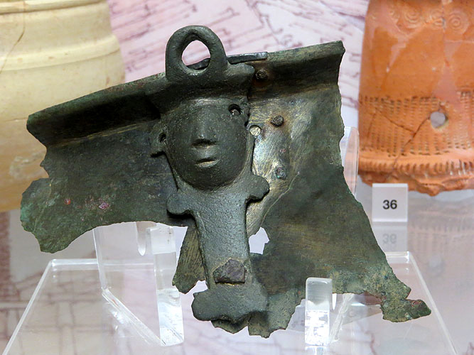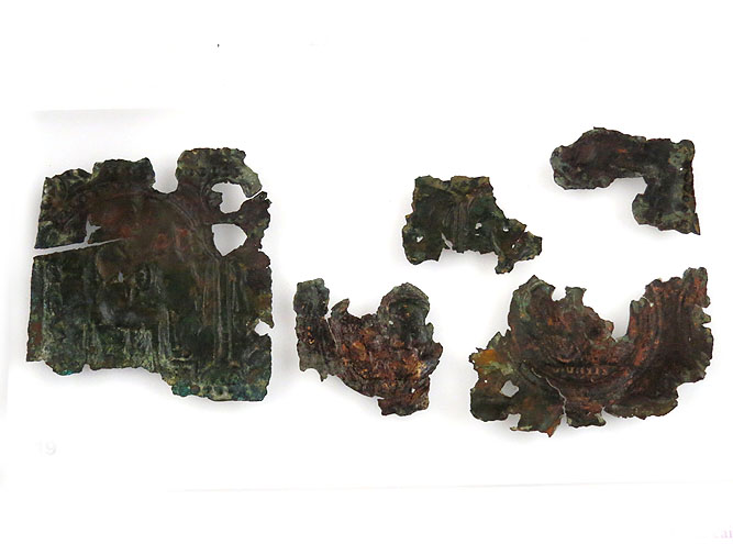 Fragments d'una placa de bronze d'una caixa de núvia, la Font del Vilar (Avinyonet de Puigvistós, Alt Empordà). Segle IV dC. |
