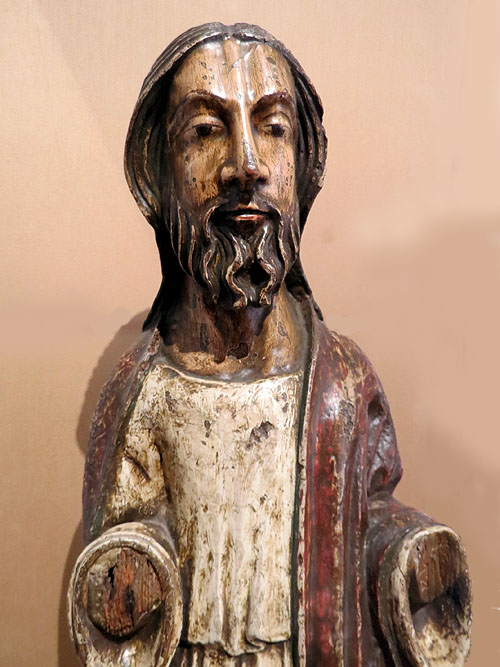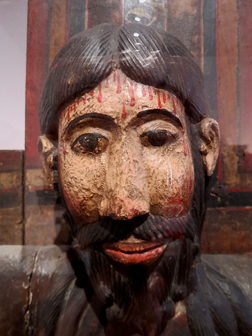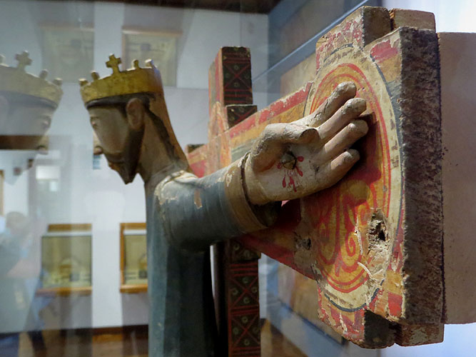 També hi és molt representada l’escultura arquitectònica derivada de claustres i portalades, amb una notable col·lecció de capitells de procedència, iconografia i formes diverses. D’aquest grup sobresurt un cap de marbre atribuït al taller del Mestre de Cabestany, procedent del monestir de Sant Pere de Rodes, donació efectuada per Joaquim Cusí i Furtunet i de la seva filla Josefina Cusí a la Generalitat de Catalunya l’any 1992. ![]() Sant Crist en Majestat. Segle XII. Detall del revers. Sant Miquel de Cruïlles - (Ampliar)