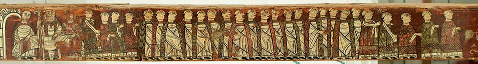 A continuació hi ha un grup de clergues amb capa pluvial, totes adornades de forma diversa. S'hi pot apreciar la caputxa, que als primers temps portaven les capes pluvials. Els monjos estan vistos de perfil i amb la boca mig oberta en actitud de cantar. Alguns sostenen llibres, uns altres porten un encenser i la majoria aguanten una espalmatòria. Els monjos que precedeixen el grup, a l'extrem dret, vesteixen dalmàtica i sostenen uns canelobres. Als ambdós costats de la processó hi ha estilitzacions vegetals resoltes amb uns puntejats blancs. ![]() Sant Crist en Majestat. Segle XII. Detall del revers. Sant Miquel de Cruïlles - (Ampliar)