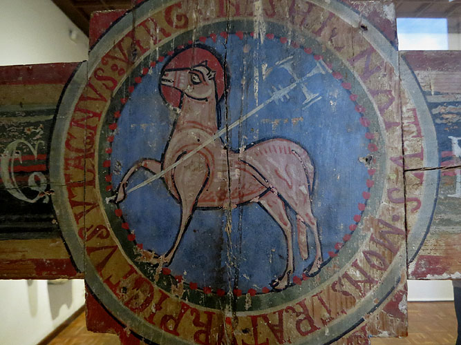 També destaca el fons d’objectes litúrgics, amb elements curiosos com la Lipsanoteca de Bestracà, talles de fusta policromada amb representacions marianes i de sants, procedents d’arreu de la diòcesi, així com també la Biga de Cruïlles, exemple fragmentari i gairebé únic d’un baldaquí del segle XII, que ha conservat la policromia en la seva totalitat. El recorregut per les peces del temps del romànic conclou amb les pintures al fresc de l’absis de Sant Andreu de Pedrinyà, a La Pera, Baix Empordà. Finalment el visitant descobreix un dels símbols tradicionals i turístics de la Girona actual: l’autèntica columna amb relleu de la Lleona, del segle XIII. ![]() Vista de la primera sala de preromànic i romànic - (Ampliar) Peces clau. Ara portàtil de Sant Pere de Rodes. Segle X.