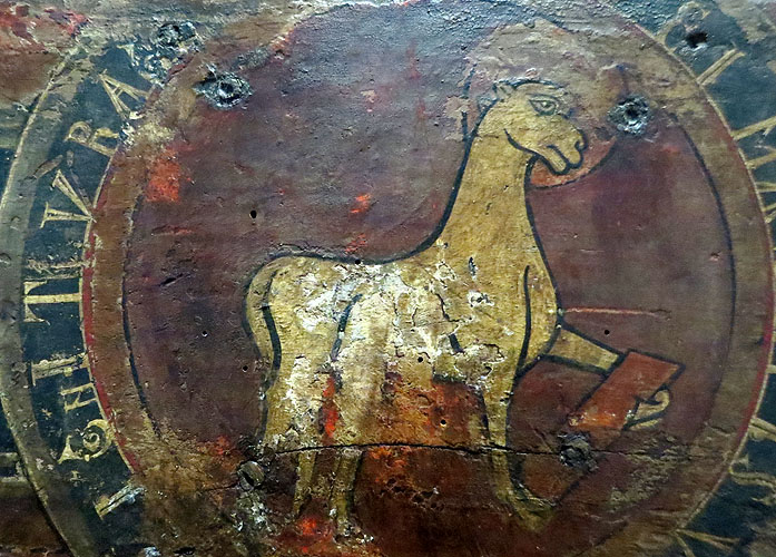 Procedent del Monestir de Sant Miquel de Cruïlles, Baix Empordà, fa 370 cm de llargada, de secció rectangular de 13,5 cm per 9 cm i està pintada al tremp. Els colors que destaquen en la decoració són sobretot terrosos: ocres, vermells, marrons, amb tocs de verd i blanc en zones puntuals. Les cares inferior i posterior de la biga han estat decorades només amb motius florals. La millor conservada és la inferior. ![]() La biga de Cruïlles. Segle XIII. Vista general de l'anvers - (Ampliar)