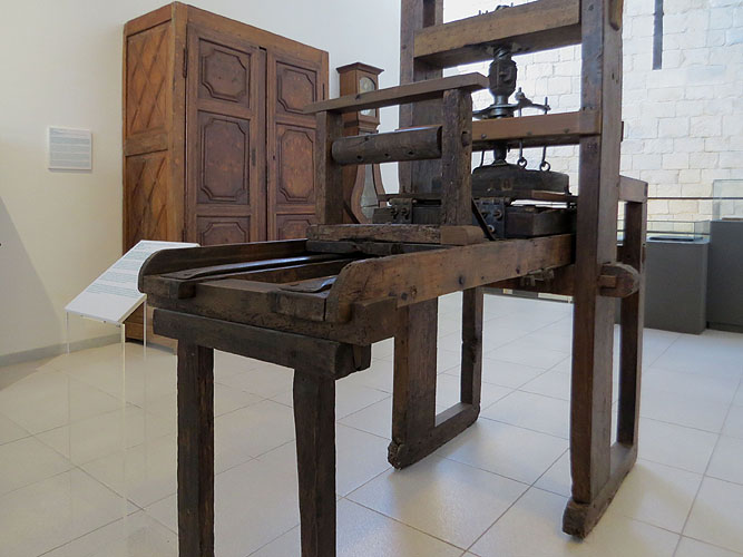 És del tipus anomenat Gutenberg. L'ús de la impremta a la ciutat de Girona és conegut des de finals del segle XV, però no va ser fins al segle XVII que hi sorgiren diferents tallers d'impressió afavorits per l'existència de la universitat. És en aquest període que fan eclosió a Girona famílies de llibreters importants, com els Garrich, a la primera meitat del segle XVII o els Palol, que ho havien fet a la segona meitat. ![]() Premsa d'impremta. Segle XVII - (Ampliar)
