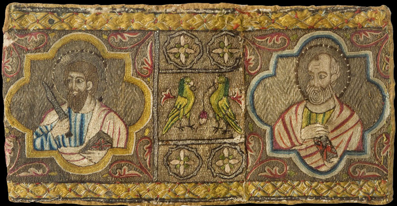A partir de 1320-1340 es generalitza la utilització de l’alabastre de Beuda, La Garrotxa, com a material preferent en l’estatuària de culte, bona mostra de la qual és la Mare de Déu de L’Esperança, d’autor anònim i provinent del desaparegut convent de Sant Francesc de Girona, o els fragments del grup del Sant Sepulcre de l’església de Sant Feliu, atribuïts al taller dels mestres reials Aloi de Montbrai i Jaume Cascalls, sense oblidar un magnífic relleu de Pere Oller, autor, entre d’altres, del sepulcre del cardenal Anglesola a la Catedral de Girona. ![]() El Saló del Tron amb la col·lecció de retaules - (Ampliar) El majestuós Saló del Tron reuneix un dels conjunts més destacables a Catalunya de retaules pintats al segle XV, com el retaule de Sant Miquel de Cruïlles de Lluís Borrassà; el retaule de la Mare de Déu de Canapost, del mestre homònim; el de Sant Miquel de Castelló d’Empúries, amb intervenció de Joan Antigó, Honorat Borrassà i Francesc Vergós I; el retaule de Sant Pere de Púbol de Bernat Martorell; el retaule de Santa Cristina de Corçà, atribuït al mestre d’Olot; i el retaule de la Pietat de Jaume Cabrera, provinent de la capella de Santa Caterina dins la parròquia de Sant Genís de Torroella de Montgrí. ![]() Estola de Sant Pau i Sant Pere. Brodat. Segle XIV. Sepulcre de Sant Narcís. Església de Sant Feliu, Girona - (Ampliar) Peces clau. Mare de Déu de l'Esperança. Segle XIII-XIV.