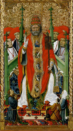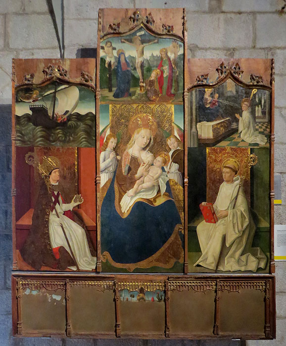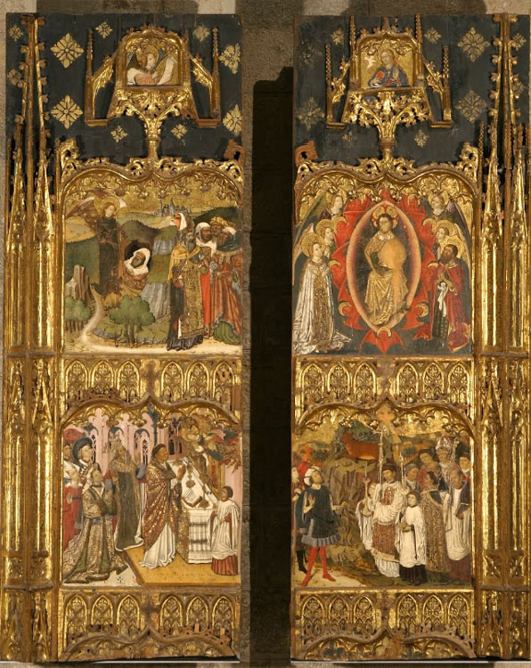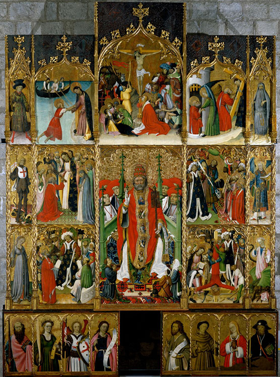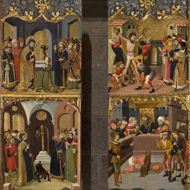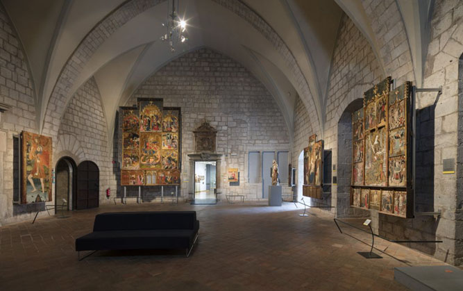 Museu d'Art de Girona GÒTIC (4a. part). ELS RETAULES. El majestuós Saló del Tron reuneix un dels conjunts més destacables a Catalunya de retaules pintats al segle XV, com el retaule de Sant Miquel de Cruïlles de Lluís Borrassà; el retaule de la Mare de Déu de Canapost, del mestre homònim; el de Sant Miquel de Castelló d’Empúries, amb intervenció de Joan Antigó, Honorat Borrassà i Francesc Vergós I; el retaule de Sant Pere de Púbol de Bernat Martorell; el retaule de Santa Cristina de Corçà, atribuït al mestre d’Olot; o el retaule de la Pietat de Jaume Cabrera, provinent de la capella de Santa Caterina dins la parròquia de Sant Genís de Torroella de Montgrí. ![]() El Saló del Tron amb la col·lecció de retaules - (Ampliar) Retaule de Sant Miquel de Cruïlles.