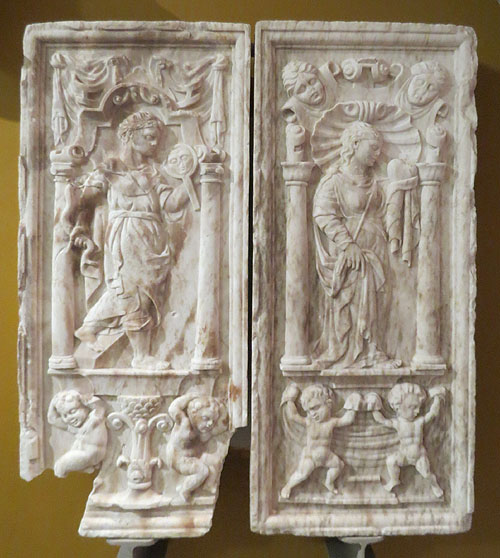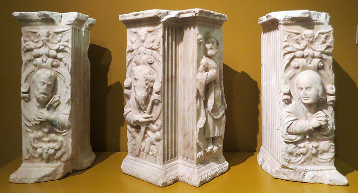 Tant la persona de Pere Mates com la seva obra han anat essent identificats de manera lenta i progressiva gràcies a l'estudi de diferents fonts documentals. Fins fa poc anys es desconeixia la seva personalitat, i el conjunt de la seva obra, catalogada pel restaurador Sutrá (1956-1957) s'atribuïa a un pintor anònim, que Post (1958) batejà amb el nom de “Monogramista català”, pel fet de signar-ne algunes amb un monograma format per les lletres MTAS. Amb aquest fet, Pere Mates ja ens demostra la novetat de la seva obra i la seva actitud personal envers la seva professió. ![]() Pilastres de retaule. Ca. 1500-1550. Alabastre - (Ampliar). Peces clau. Taula de Santa Úrsula.