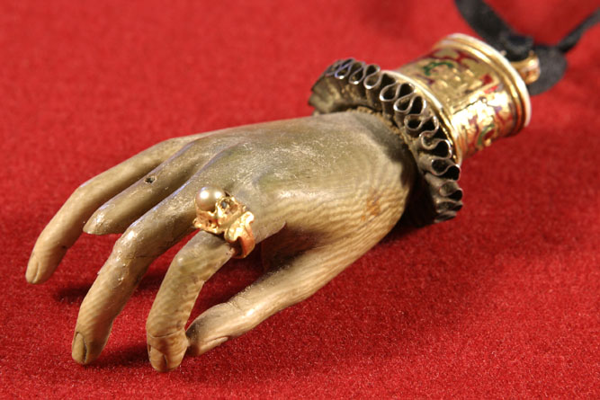 És un penjoll d'orfebreria en forma de mà realitzat amb or, plata, ivori i esmalt. Segons la tradició oral, va ser una ofrena de l'emperador Carles V a la Mare de Déu de Castelló d'Empúries l'any 1533. ![]() Una de les sales amb obres del segle XVI - (Ampliar). Peces clau. El retaule de Segueró, de Pere Mates.