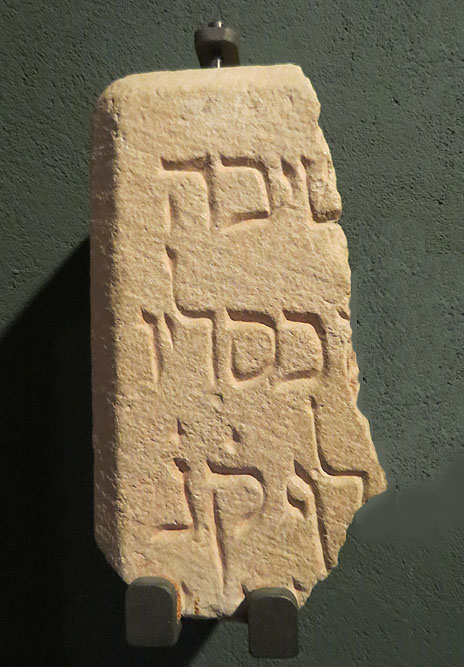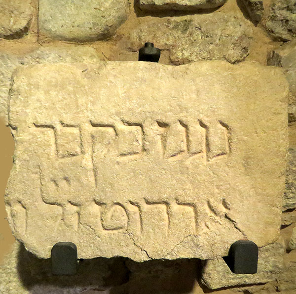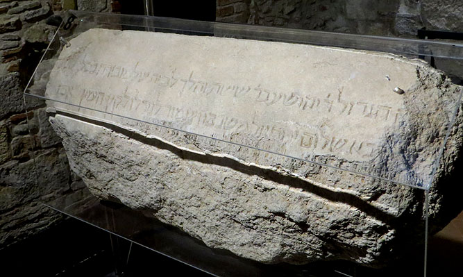 Làpida funerària. 1343. Castelló d'Empúries. Es va complaure en els preceptes del Senyor, es va apiadar del pobre i es va allunyar del Mal. Temerós de Déu, va morir el dia del càstig, va sortir net de culpes; el seu nom és R. Rovèn, fill de R. Hanina, sigui el seu record per a la vida eterna.