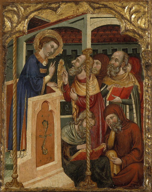 Sant Esteve i els jueus a la sinagoga. Segle XIV. Predel·la del retaule de Sant Esteve. Cercle d'Arnau Bassa. Museu Nacional d'Art de Catalunya - (Ampliar)