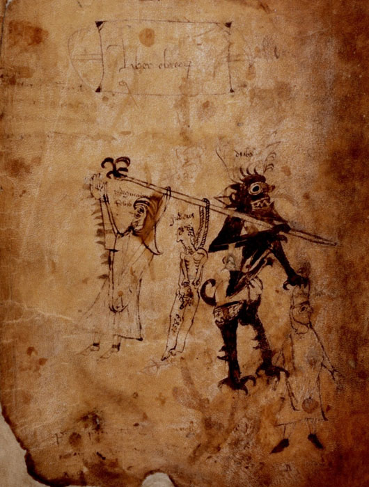 Malgrat molts períodes de coexistència relativament pac&iacuute;fica, al llarg dels segles medievals es va desplegar la violència, tant física com psicològica, contra les persones jueves; són nombroses les representacions difamants i caricaturesques en retaules i obres d'art, o als llibres dels notaris. Igualment es van generalitzar les acusacions infamants contra la població jueva, com la de fer sacrilegi amb hòsties consagrades, la d'enverinar les aigües per provocar epidèmies, o la de matar ritualment criatures cristianes. ![]() Jueu amb rodella. Manual d'Acords del Consell de la Ciutat. Girona, 1449 - (Ampliar)