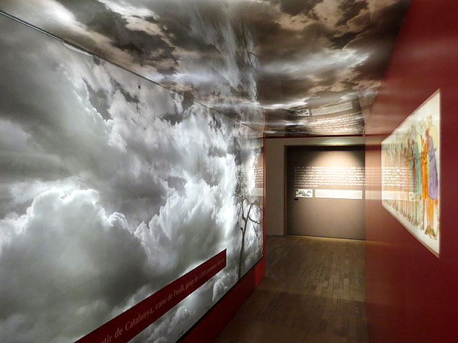 A partir del segle XIV va augmentar la violència física contra barris, persones i béns jueus. El punt àlgid va ser el gran avalot contra els calls, l'estiu de 1391. El Call de Girona va ser atacat la nit de Sant Llorenç, el 10 d'agost; hi van morir unes 40 persones, molta gent es va batejar i la resta es va refugiar a la Torre Gironella durant més de 17 setmanes en condicions lamentables. ![]() Vista parcial d'una de les sales del Museu d'Història dels Jueus de Girona sobre coexistència i marginació - (Ampliar) 9. Societat conversa i Inquisició. El 1478 els Reis Catòlics van crear el Tribunal del Santo Oficio de la Inquisición, per perseguir l'heretgia i imposar la fe cristiana. Tota la població conversa era, per a la Inquisició, sospitosa de judaitzar en secret. Per això se la controlava i se la perseguia amb insistència. La sala gira entorn els horrors i les penúries d'aquelles i aquells que foren perseguits i torturats. [Article principal] ![]() Vista parcial d'una de les sales del Museu d'Història dels Jueus de Girona sobre l'expulsió dels jueus - (Ampliar)