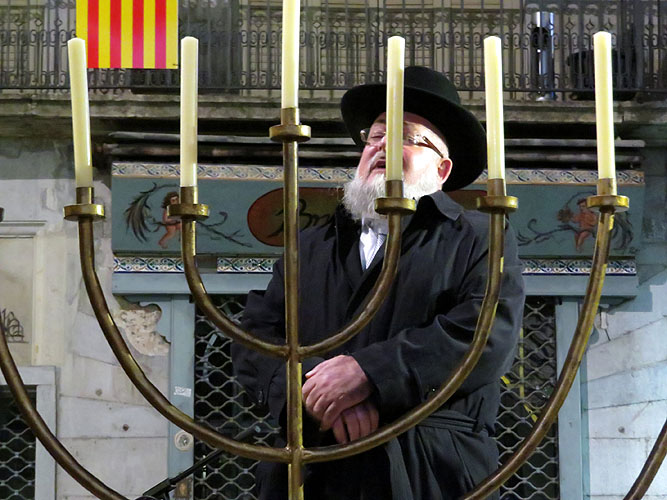Diumenge, 13 de desembre 2015 Reportatge fotogràfic i article de la celebració de l'encesa de les llums de Hanukkà a la plaça del Vi. Article, 64 fotografies i 1 video