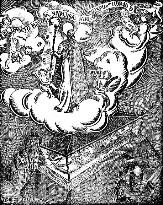 (Ampliar) - Dibuix dels Manaies de Girona. Publicat al programa de Setmana Santa de 1948. Enric Marquès, al seu article 'L'homenatge al pintor Joan Orihuel', publicat al diari 'El Punt', el 27 de febrer de 1983 esmentava que "era un projecte difícil, el d'Orihuel, un projecte de realització artística carregat de força dosis de megalomanía. [...] "la seva inquietud, la seva ambició, el caràcter extrovertit del personatge interpretant el paper d'artista en aquella Girona ultraprovinciana, no podien passar desapercebuts. Ni deixar de produir els seus efectes".