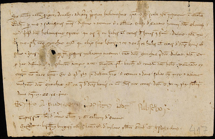 (Ampliar) - 29 de juliol 1389. Joan Sans de Fellines, la seva esposa Bonanata Batllesa, del Mas Batlle, i Bernat Batlle venen a Pere Balell els censos d'unes terres situades vora el Puig dels Olms de Girona i al Mas Uro de Girona, que eren rebuts per l'Almoina del Pa de la Seu de Girona. Biblioteca de Catalunya.