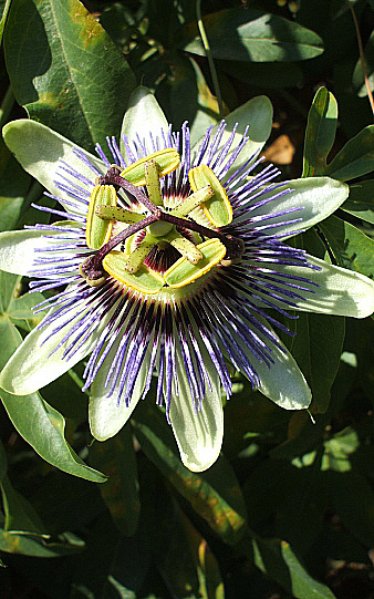 Passionària o Flor de la Passió (Passiflora caerulea)![]() El nom popular que dessigna la planta fa referència a la Passió de Crist: en el dibuix interior de la corol·la s'hi troba una semblança en la corona d'espines; tanmateix la quantitat d'estams, cinc, és el de les ferides que va rebre Jesús i els tres estils, els claus amb què va ser clavat a la creu. També hi ha qui diu que els pètals representen els apòstols, malgrat que n'hi han deu. |