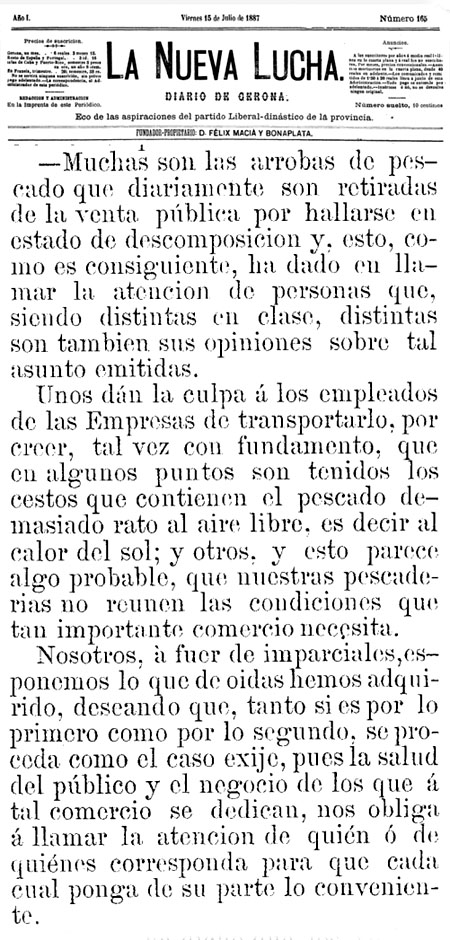 El "Diario de Gerona de avisos y notícias" del 23 de novembre de 1892 deia que "Ayer se lamentaba la gente de que mientras el pregonero anunciaba la venta de diferentes clases de pescado, en la pescadería no había la mitad de aquellas. Y como eso sucede con bastante frecuencia y se considera como un ardid para atraer la gente nos parece que no está bien que el vendedor se valga de un empleado del municipio para darle un mico al público".