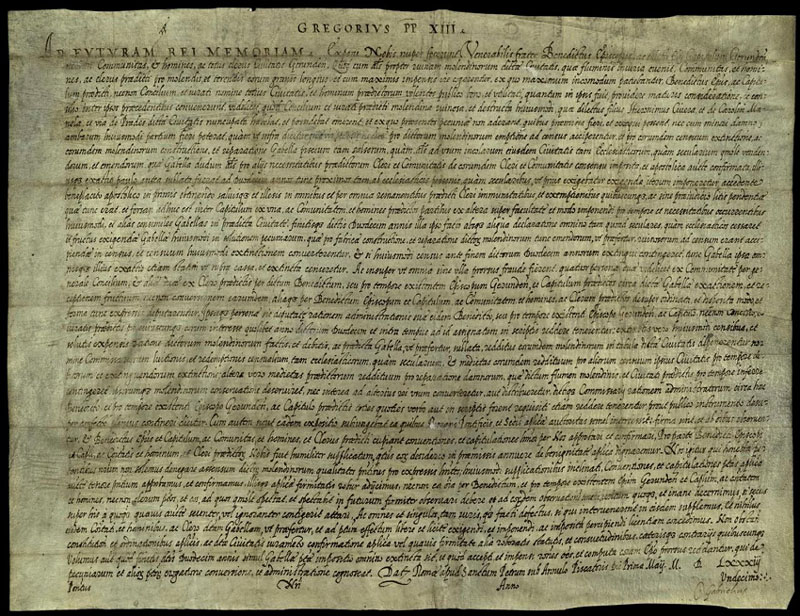 (Ampliar) - 1 de maig de 1583. Breu atorgat pel papa Gregori XIII en el qual aprova i confirma els capítols acordats entre Benet de Toco, bisbe de Girona, i el Capítol de l’esmentada ciutat d’una banda, i el Consell i jurats de la ciutat de Girona, de l’altra. Aquests capítols estableixen per un període de dotze anys la gabella (impost) sobre el peix, tant si és salat com si no, venut o comprat a la ciutat, que havien de pagar els habitants de Girona, eclesiàstics i seculars. Fons Ajuntament de Girona.