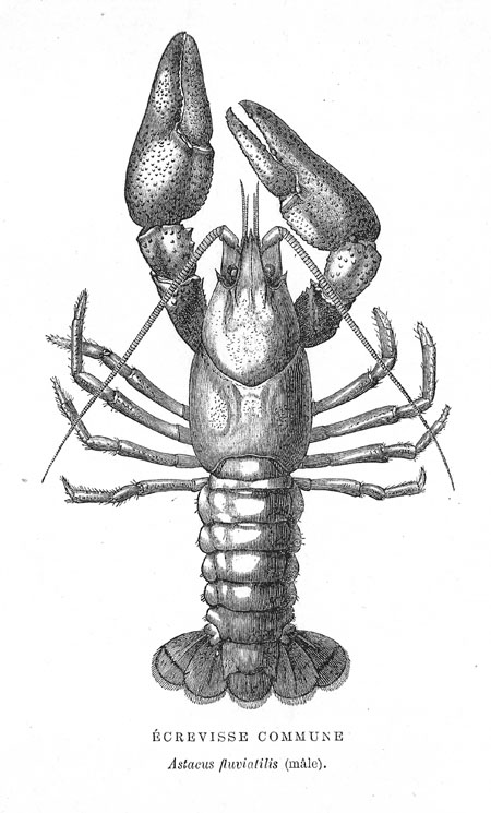 (Ampliar) - Cranc de riu, una de les espècies que es venien als mercats del peix a Girona. Gravat de "L’Écrevisse : introduction à l'étude de la zoologie", de Thomas Henry Huxley, 1880.
