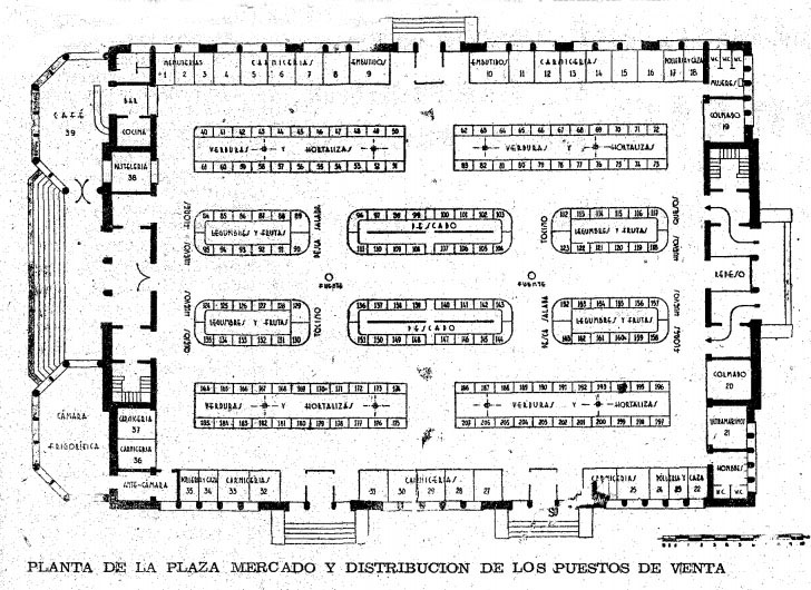 (Ampliar) - Vista deDistribució inicial de les parades del Mercat del Lleó. Les parades de peix ocupaven l'espai centre, del lloc 96 al 144. De la notícia de la inauguració del mercat. Diari "Los Sitios de Gerona" del 16/11/1944.
