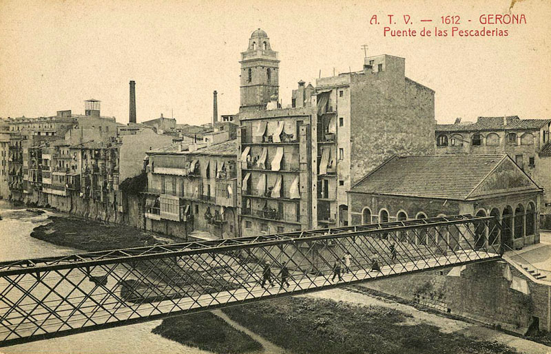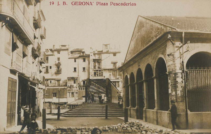 (Ampliar) - Les Peixateries Velles. 1920-1926. Valentí Fargnoli i Annetta. CRDI - Ajuntament de Girona. A finals del segle XIII trobem definit el mercat del peix amb més precisió: entre 1291 i 1292 s’esmenten fins a tres vendes de drets de propietaris jueus sobre taules del sector, situades d’est a oest, a la Peixateria de Girona, en l’alou reial; que podrien situar-se en l’actual plaça de les Castanyes, o en un espai, avui edificat, d’amplada semblant. A diferència del que havia passat amb moltes altres activitats comercials, que passaren al mercat de l’Areny al llarg del segle XIII, les taules de les peixateries encara es mantenien en el lloc del mercat vell on havien estat establertes en el segle XII.