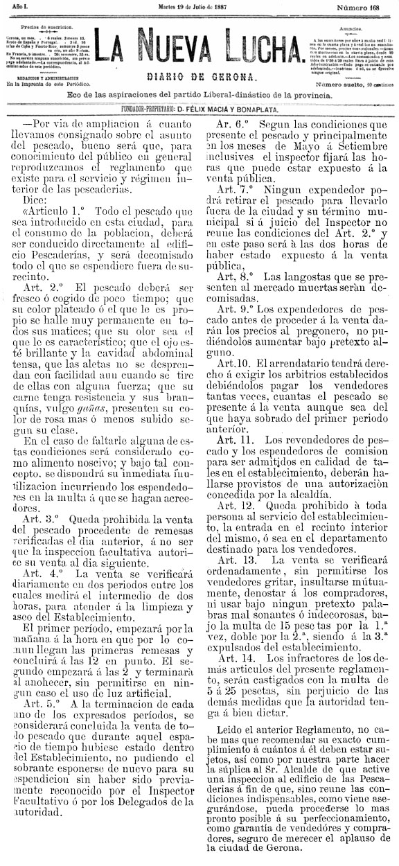(Ampliar) - Reglament interior de les peixateries. Diari 'Nueva Lucha' del 19 de juliol de 1887.