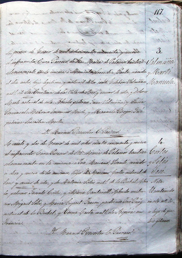 (Ampliar) - Registre del llibre de baptismes de la parròquia de Santa Maria de Palamós amb la inscripció de Josep Cortés i Solés. Arxiu Diocesà de Girona.