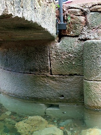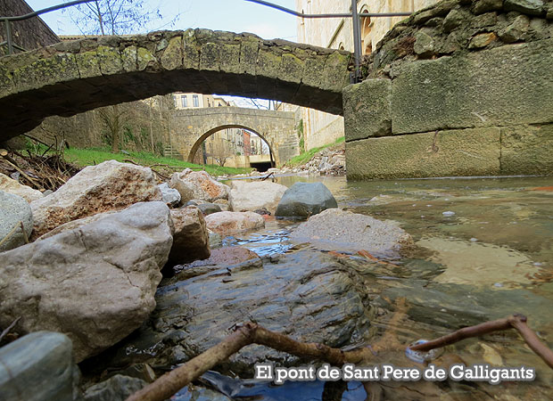 Pont de dubtós origen i utilitat, possiblement es tracta d'un pas sota la muralla de la ciutat per salvar el curs del Galligants. Els treballats elements que suporten pels dos extrems l'actual passera, mantinguda quan les obres del passeig Arqueològic, inaugurat el 1961, fan suposar que es tractava d'una construcció important. Formaria part de les noves defenses de la ciutat, del segle XIV, quan Pere III el cerimoniós ordenà la construcció de les noves muralles per protegir tots els nuclis de població que havien anat sorgint fora de l'antic recinte. La nova fortalesa havia d'incloure: Sant Feliu, Sant Pere, Santa Eulàlia, l'Areny, Vilanova i el Mercadal, tot i que l'emmurallat d'aquest darrer nucli no es va iniciar fins a la primera meitat del segle XV.