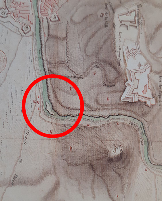 (Ampliar) - Plànols de Girona de 1711. La ubicació del pont està encerclada. Bibliothèque nationale de France