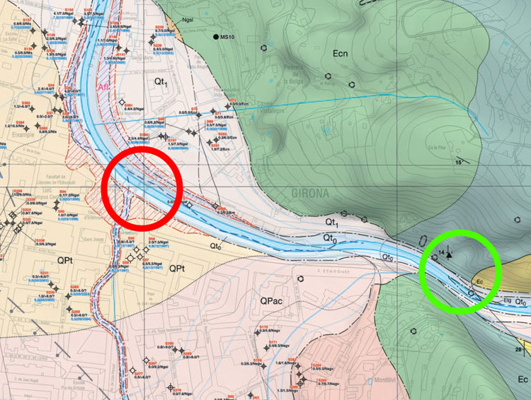 Mapa geològic de la zona amb les dues localitzacions del Pontem Fretum: a l’esquerra, la tradicional i, a la dreta, la nova. Foto: Institut Cartogràfic i Geolograve;gic de Catalunya - (Ampliar)