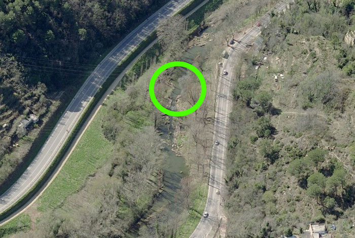 La ubicació que es proposa, amb els arguments que intentaran demostrar-ne la certesa, se situa en un paratge a vuit-cents metres aigües amunt de l’emplaçament tradicional. Aquest lloc es troba a mig camí entre les anomenades Tres Roquetes, una antiga zona d’esbarjo fluvial, i els primers murs del cementiri vell de Girona, a la carretera de Sant Feliu de Guíxols. Les seves coordenades són 41º 58' 21,46" N, 2º 50' 02.50" E. En la documentació gràfica i en les ortofotos que es presenten, la ubicació tradicional apareix marcada amb un cercle vermell i la proposada, amb un de verd.