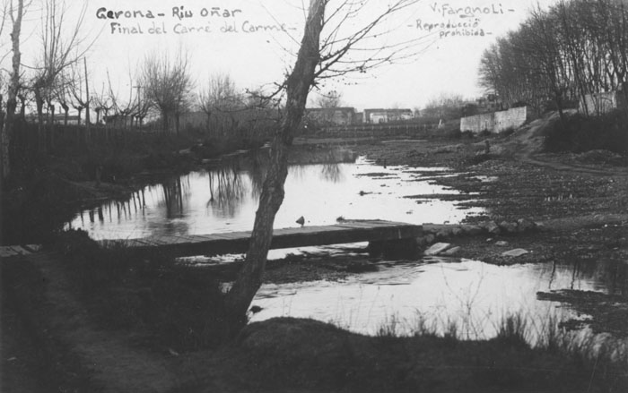 L’ample llit del riu Onyar en sortir del congost, amb una palanca per travessar-lo, el 1911. Foto: Valentí Fargnoli, CRDI - Ajuntament de Girona - (Ampliar)