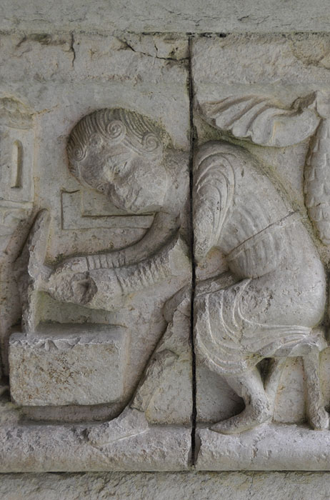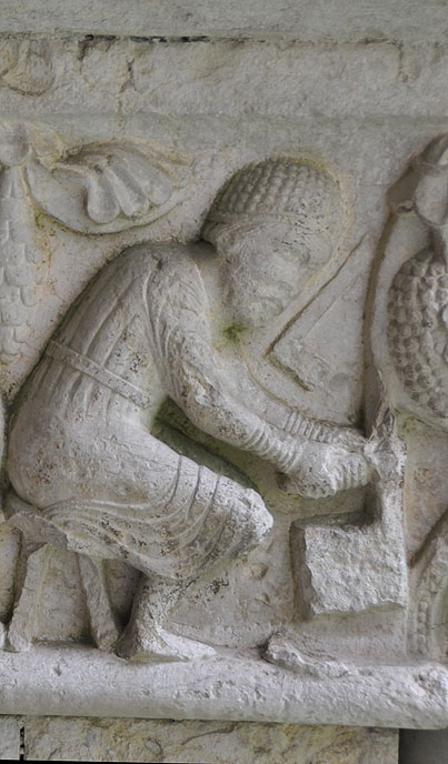 (Ampliar) - Picapedrer en un fris del claustre de la Catedral de Girona, segona meitat del segle XII