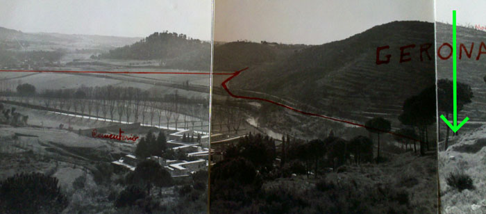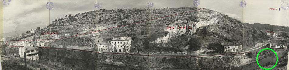 Límits entre Girona i Sant Daniel, vistos des del puig de Montilivi, el 1961. Encerclada, la ubicació del pont que es proposa. CRDI - Ajuntament de Girona - (Ampliar)