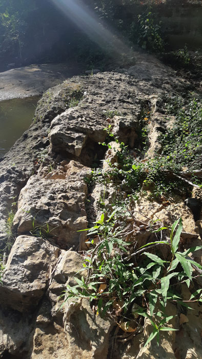 S’observa també un desgast inusual en tota la superfície de la mateixa llosa, amb diversos solcs longitudinals bastant irregulars. Aquests podrien ser conseqüència del sobreesforç de les seves parts més febles en sostenir una gran càrrega vertical, fos un pilar o la via que conduïa al propi pont. També es podria tractar de regates manuals que servirien per afermar el morter que lligaria amb solidesa els carreus a la mateixa roca. És significatiu que cap de les altres lloses properes a aquesta no mostrin aquests senyals.