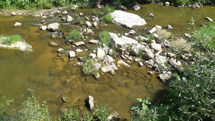 Antics carreus del pont arrossegats i enfonsats riu avall de la nova ubicació. Foto Ramon Prior - (Ampliar)