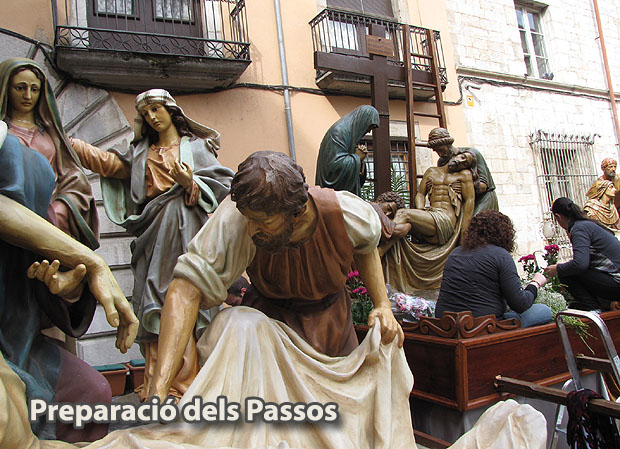 Durant tot el matí del Divendres Sant, té lloc l'arranjament floral dels Passos que participaran a la Processó del Sant Enterrament del vespre. Dos Passos, el Pas de la Caiguda i l'Ecce Homo, de la Confraria de Jesús Crucificat, que han estat exposats al Castrum dels Manaies a l'església de Sant Lluc els dies anteriors, són preparats davant aquest edifici, i la resta, que procedeixen de l'església dels Dolors, ho só a la plaça de la Catedral.