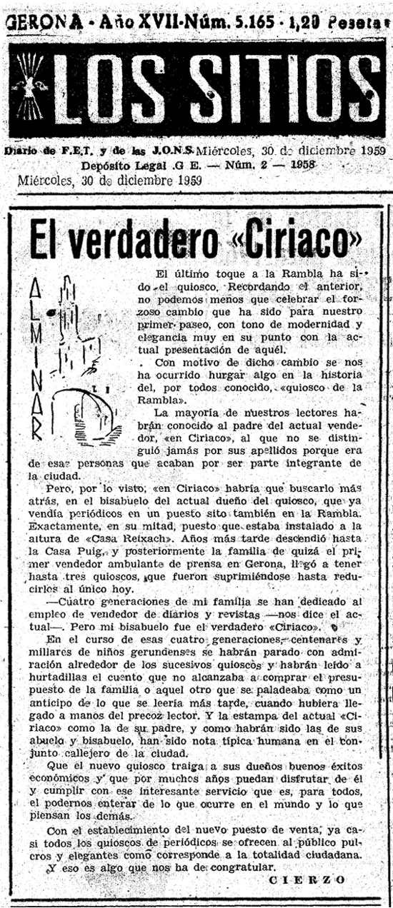 (Ampliar) - Article sobre 'En Ciriaco' del quiosc de la Rambla de la Llibertat. 'Los Sitios de Gerona'. 30/12/1959.