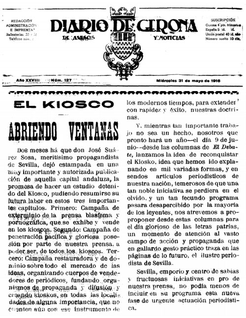 (Ampliar) - Article publicat al 'Diari de Gerona'. 31/5/1916. Un altre exemple dels articles encaminats depurar la oferta del quioscos amb una "campaña de exterminio de la prensa blasfema y pornográfica, que se exhibe y vende en los kioscos" i una "campaña de penetración pacífica y gloriosa [...] de nuestra prensa".