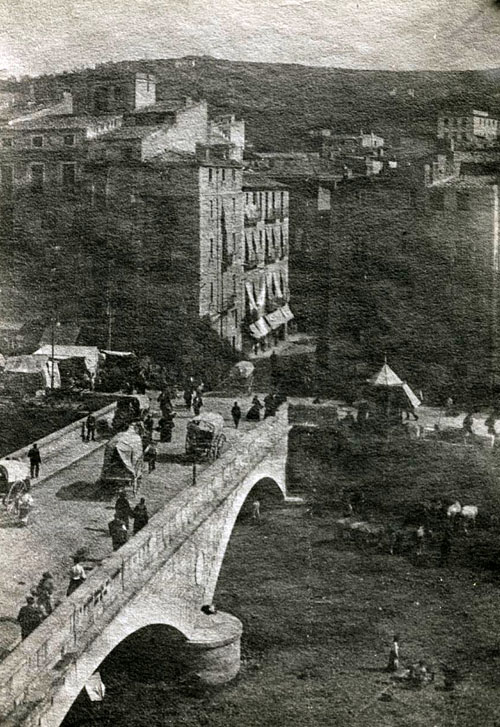 (Ampliar) - Vista des d'un punt enlairat del pont de Pedra i de l'Areny amb el mercat del bestiar boví. S'hi observa el quiosc de begudes. 1910. Josep Thomas Bigas. CRDI - Ajuntament de Girona.