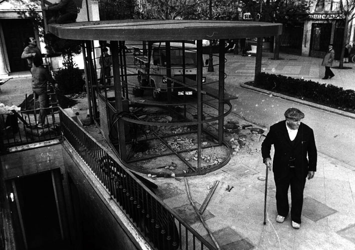 (Ampliar) - Instal·lació del nou quiosc de la Rambla de la Llibertat. 2/12/1986. Miquel Mundet. CRDI - Ajuntament de Girona.