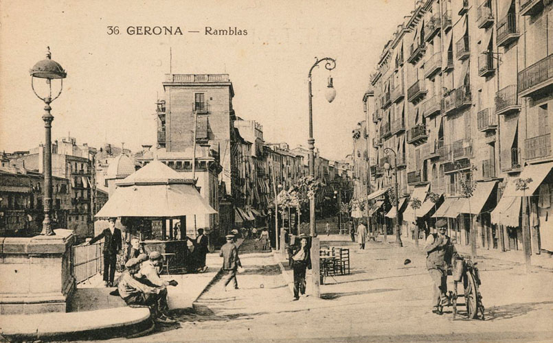 (Ampliar) - Vista de la rambla de la Llibertat des de la pujada del pont de Pedra. Al centre s'hi observa el quiosc de periòdics. 1910. Autor desconegut. CRDI - Ajuntament de Girona Dos mesos més tard, Ciriaco Marull sol·licitava poder vendre també refrescs al quiosc de periòdics de la rambla d'Álvarez, el que va ser aprovat a primers d'abril de 1906, amb la condició que el quiosc estés en la mateixa línia que el del senyor Montaña (LL, 7/4/1906). Segons un altre diari (LG 7/4/1906) es desestimava la petició del senyor Marull per convertir el quiosc de diaris en un de refrescs.