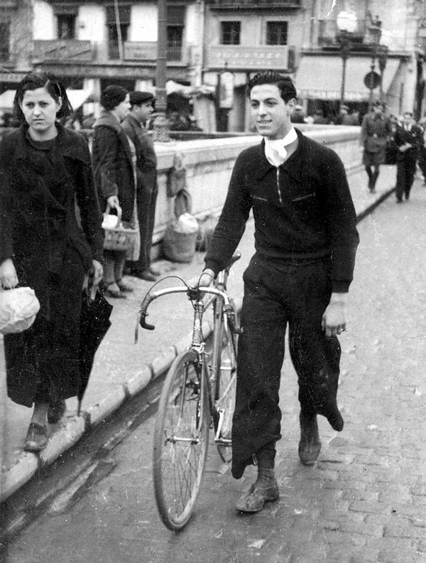 (Ampliar) - Retrat de Cinta Ferragut i Albert Marull passant pel pont de Pedra amb la seva bicicleta. 1929-1930. AUtor desconegut. CRDI - Ajuntament de Girona.