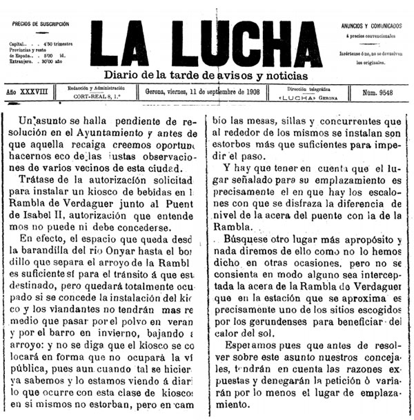 (Ampliar) - Article publicat al diari 'La Lucha' oposant-se a la instal·lació d'un quiosc de begudes a la Rambla Verdaguer. 11/9/1908. El dia 3/10/1908, el mateix diari publicava que "El señor Balari interesó el pronto despacho de una instancia en la que se solicita autorización para instalar un kiosco en la Rambla de Verdaguer; le contesta el señor Leal de la Comisión de Fomento, que la instancia està pendiente de que el interesado presente el diseño del kiosco que trata de instalar, para evitar así la implantación de un adefesio".
