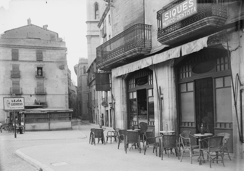 (Ampliar) - Plaça dels Vern, amb el quiosc de begudes a l'esquerra. A la dreta, el bar Can Botifarra. 1931. Salvador Crescenti Miró. CRDI - Ajuntament de Girona. L'any següent s'acordava la concessió d'una pròrroga a favor de Joaquim Pascual per establir un quiosc de begudes en el lloc on tenia emplaçats uns cavallets a la plaça de la Independencia (DdGAN, 27/1/1934). El mateix any s'assenyalava "a Joaquim Pascual en concepte d'arbitri per a ocupació de sòl amb el kiosc el permís de construcció del qual li fou prorrogat, en el passeig de Canalejas, la taxa de dues pessetes mensuals per metre quadrat de superfície; sense perjudici dels altres arbitris que en relació a dit quiosc puguin devengarse per ocupació de via pública amb taules, anunci, etc., als quals seran d'aplicació les taxes generals establertes en les Ordenances corresponents" (LA, 12/2/1934).
