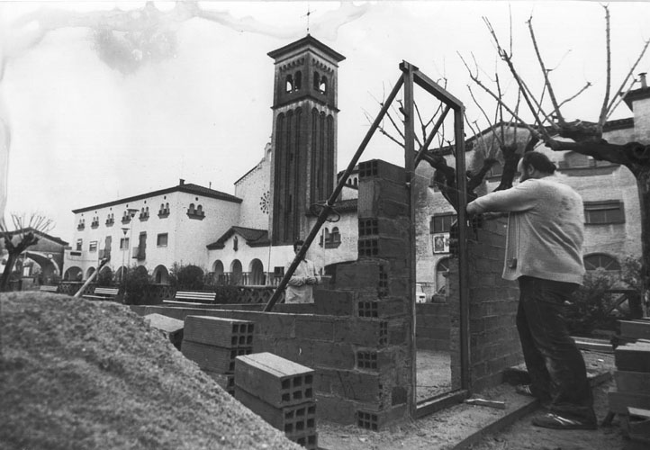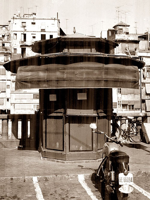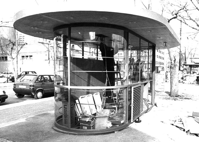 (Ampliar) - Quiosc de la plaça Catalunya. 1979-1983. Joan Comalat Vila. CRDI - Ajuntament de Girona Sis mesos més tard s'inaugurava, i la premsa s'en feia ressò. "Coincidiendo con la festividad de los Santos Pedro y Pablo, 'Dia de la Prensa e Información de la Iglesia', será mañana inaugurado el nuevo kiosco que ha sido construido en el cruce de la calle de Anselmo Clavé con la Gran Via de Jaime I, frente al Grupo Escolar. Vimos la maqueta de este centro callejero de venta de prensa y periódicos, pero no hemos podido aún contemplar la obra, o mejor dicho el proyecto, realizado. Que bien o mal el caso es que de ahora en adelante cuantos kioscos se instalen, habrán de adaptarse al modelo, como los puntos de venta de castañas tostadas en Barcelona. Repetímos que hasta ahora ha sido imposible dar el parecer, ya que una opaca barrera de ladrillos impide mirar lo construido; podemos indicar, por nuestra parte —como habrán visto los transeúntes todos— que por encima de la valla aparece una especie de cubo, todo de cristal, que tiene buena facha. Si el resto, responde al cimborio, el aspecto será agradable (LSdG, 27/6/1958).