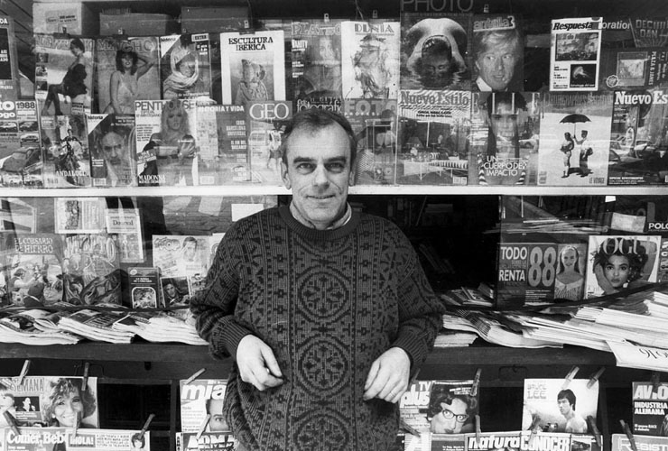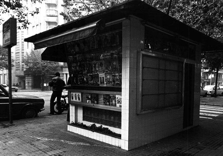 (Ampliar) - En Freddy del quiosc de la plaça Independència. 1988. Joan Castro. CRDI - Ajuntament de Girona La construcció del quiosc de la plaça de la Independència es reflectia a la premsa: "Obras en la Plaza de la Independencia. Pero no en su pavimentación, casas o monumentos... Unas paredes de tabique se están levantando, con forma cuadrada, como de quiosco, en el ángulo que queda frente al cine Gran Via. Nos dijeron que posiblemente va allí un quiosco de periódicos. Pero no nos lo confirmaron: Por todo ello, habrá de esperar. El lugar es bueno, de gran paso, incluso con el puente de San Agustín cerrado" (LSdG, 5/5/1973).
