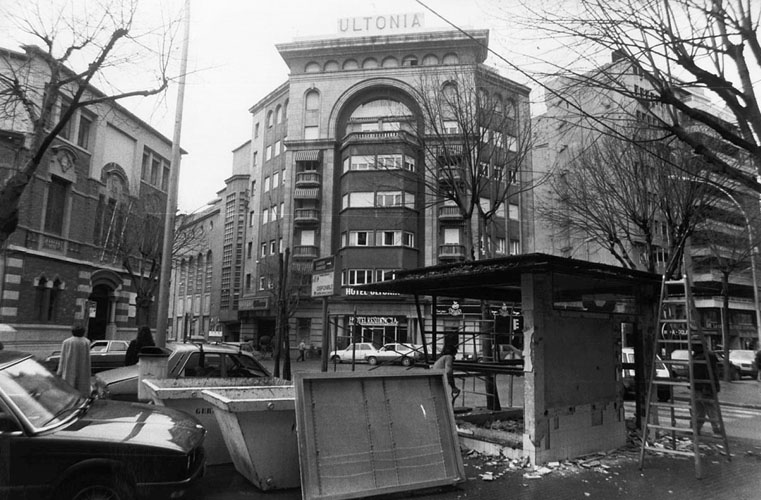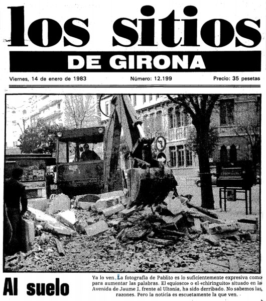 (Ampliar) - Enderrocament de l'antic quiosc del PPC a Jaume I. 'Los Sitios de Gerona'. 14/1/1983. Uns dies més tard s'afegia que "las jóvenes de Acción Católica van a emprender una campaña de propaganda en unión con las Misioneras Evangélicas quienes han tomado a su cargo el flamante quiosco modelo de la Avenida de Jaime I que hoy se inaugurará y desde el cual se expenderán todas las publicaciones de PPC (Propaganda Popular Católica) y otros diarios y revistas amenas y edificantes a la vez (LSdG, 29/6/1958).