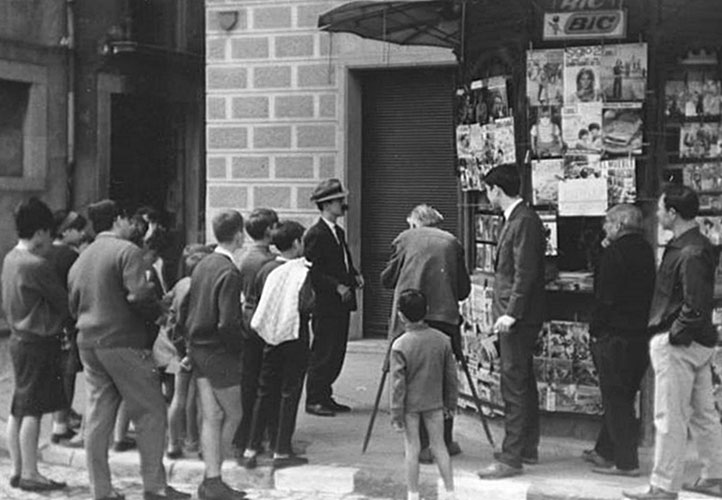 (Ampliar) - Quiosc de periòdics a davant de la Clínica l'Esperança, actual 'Casa Cacao' de Jordi Roca, a la plaça Catalunya. S'hi observa Antoni Varés durant el rodatge del film 'La bombeta'. 1965. Autor desconegut. CRDI - Ajuntament de Girona Se n'anaven instal·lant a diversos indrets de la ciutat: al passeig de Canalejas, a tocar la plaça de de la Independència, davant l'antiga Clínica l'Esperança, a la plaça Catalunya... El 1954 es denega autorització sol·licitada per muntar un quiosc dedicat a la venda de periòdics i novel·les al carrer de la Creu (LSdG, 13/2/1954).