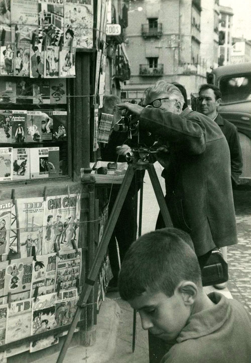 (Ampliar) - Rodatge del film 'La Bombeta'. Antoni Varés filmant al costat del quiosc de la Plaça Catalunya. 1965. Autor desconegut. CRDI - Ajuntament de Girona.