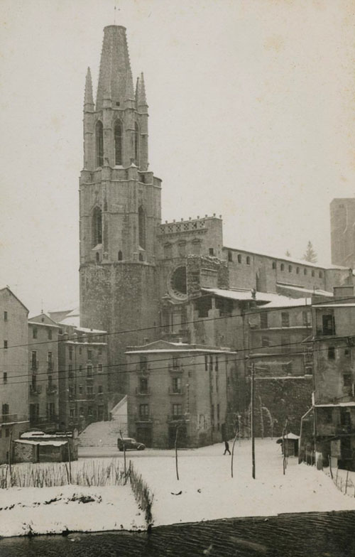 (Ampliar) - Plaça de Sant Feliu després d'una nevada. A la dreta s'hi observa el quiosc de periòdics. 2/2/1963. Josep Buil Mayral.. CRDI - Ajuntament de Girona.