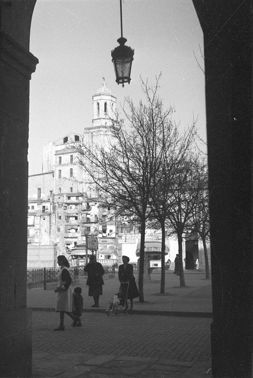 (Ampliar) - La plaça Independència vista des de les voltes de la banda nord-oest. Als fons, a l'esquerra, el quiosc de periòdics. 1950-1960. Autor desconegut. CRDI - Ajuntament de Girona.